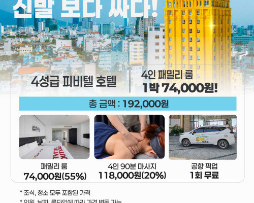 4인 가족 구성원을 위한 최고의 가성비 패키지입니다. 숙소는 저렴하게! 여행은 풍족하게!베트남 다낭 4성급 피비텔 부띠크 호텔 소개입니다.한시장에서 차로 약 3분거리에 위치해 있으며4인…2025-10-31 -